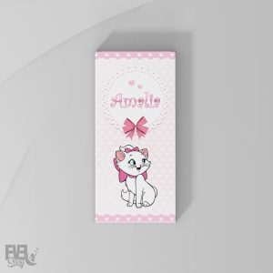 Plicuri cu pisica Marie pentru darul de botez, 20x9cm, carton lucios 240g, fundal inimioare, culoare roz, folosit si ca place card