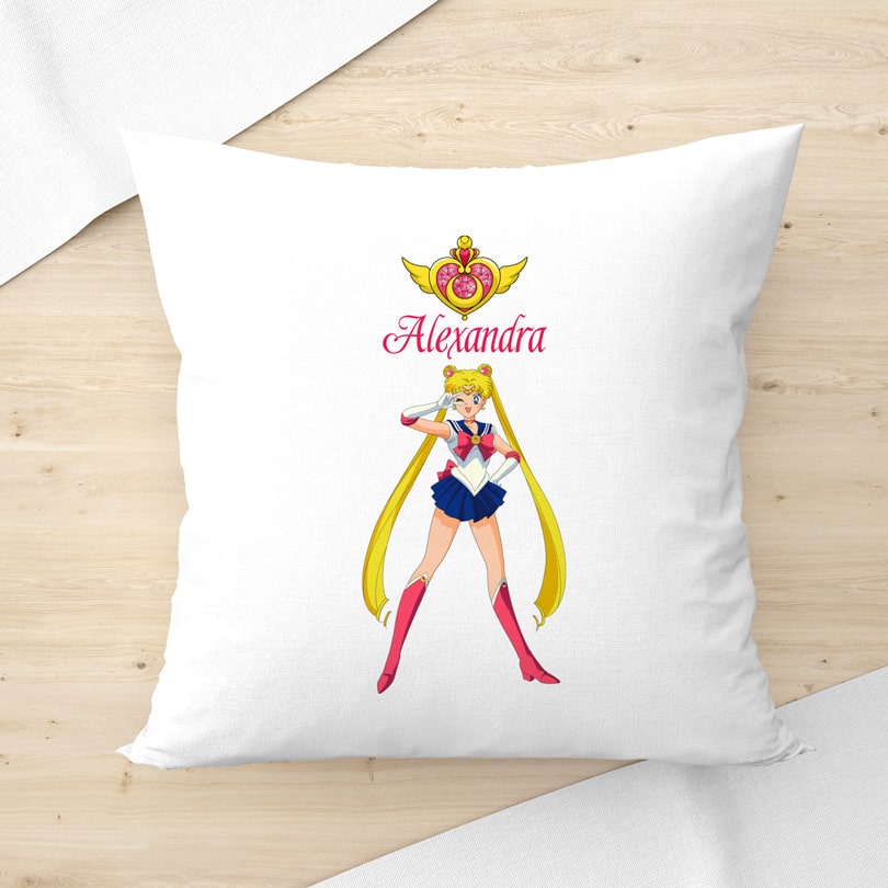 Perna Sailor Moon pentru fetite, personalizată cu nume, 40x40cm, material moale, culoare alb, model 1