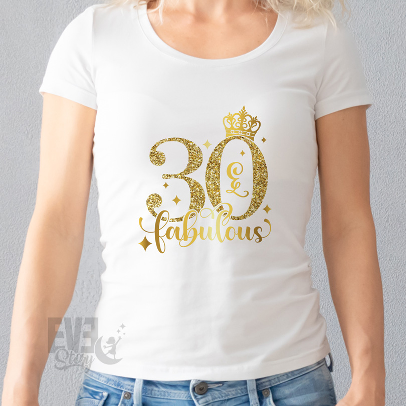 Tricou 30 de ani dama – 30 & Fabulous Gold, rezistent la spălări, bumbac 100%, regular fit, culoare negru/alb