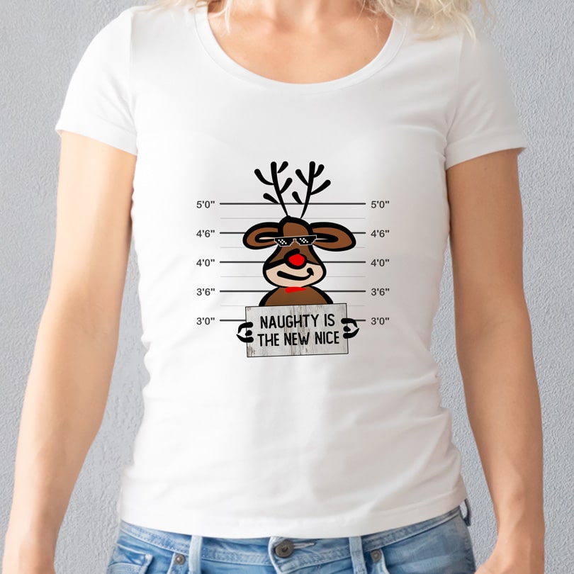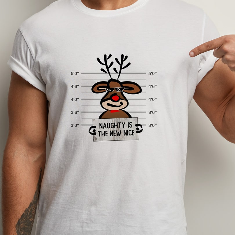 Tricou Craciun Ren, Naughty Is The New Nice, rezistent la spălări, Unisex, Regular Fit, Bumbac 100%, culoare alb